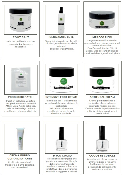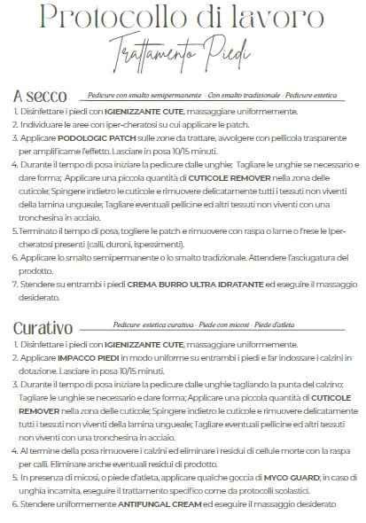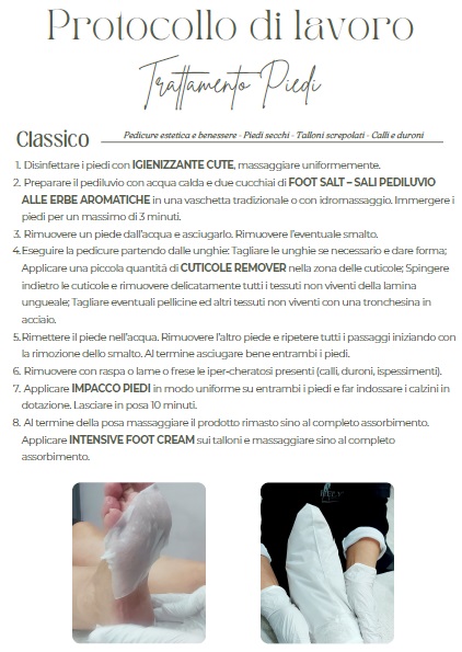 Una Nuova linea di prodotti dedicati alla cura ed al benessere dei piedi, abbinata ad un trattamento per pedicure efficace. Il trattamento si svolge seguendo uno dei 3 protocolli di lavoro, scegliendo in base alle esigenze del cliente. Ogni kit permette di eseguire tutti e 3 i protocolli descritti.